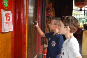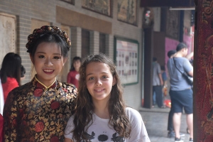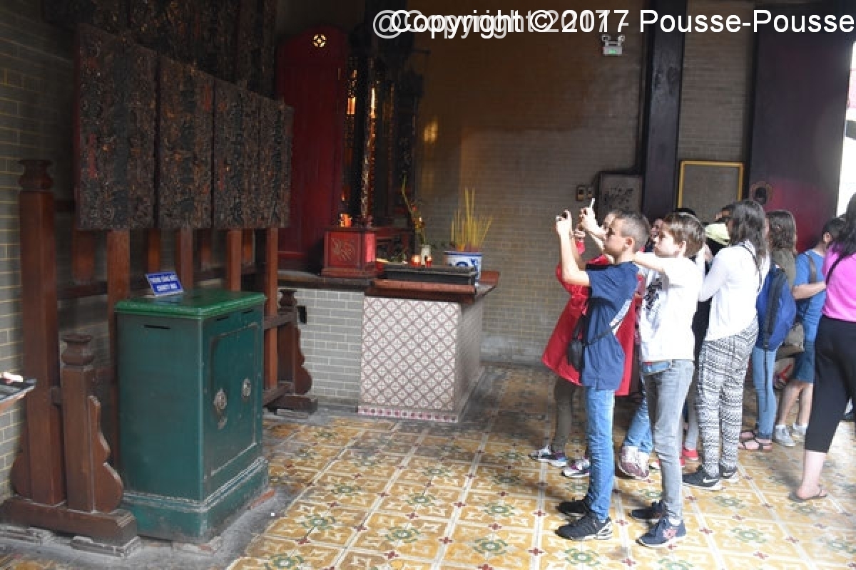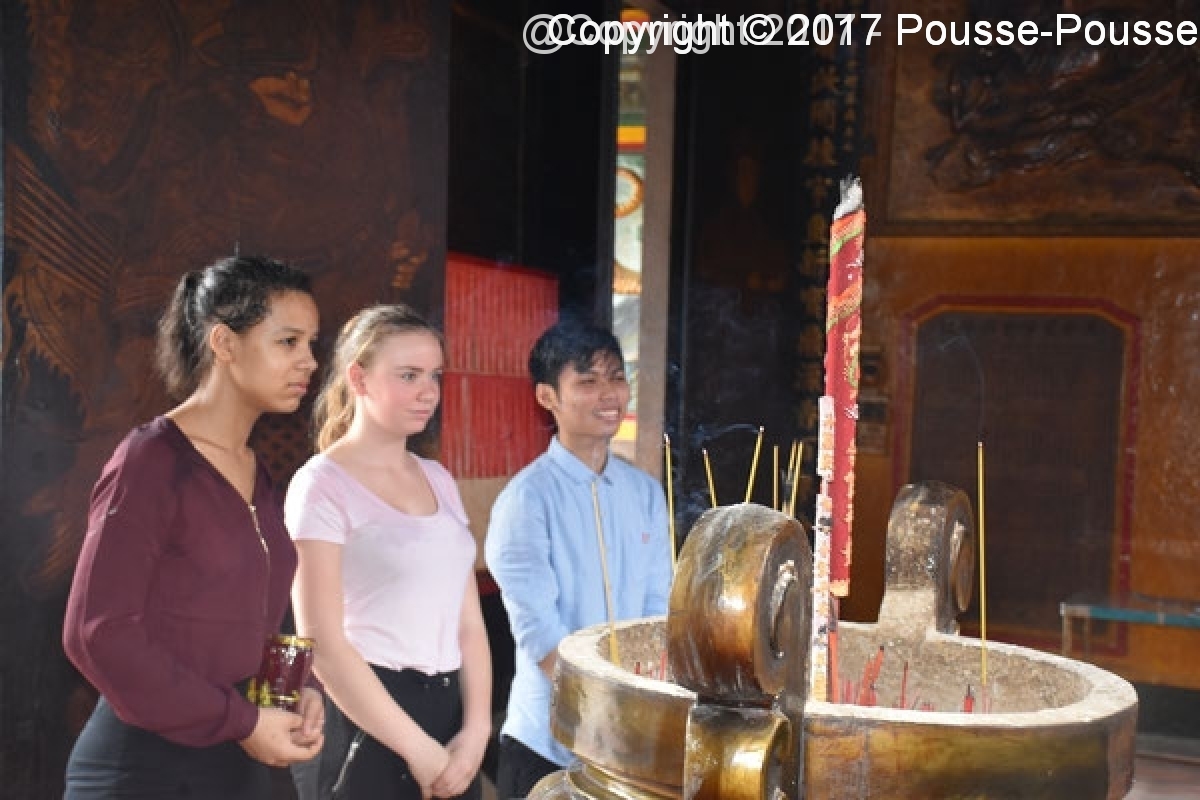 A Saigon, les jeunes ont visité les monuments incontournables comme la Poste, la Cathédrale, et sont aussi allés dans les pagodes. Ce n’est pas tant l’histoire qui les intéresse mais les odeurs, les couleurs, et ce qui se dégage de ces lieux de recueillement. J’aime cette photo avec le sourire de Sarah …