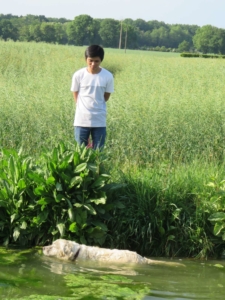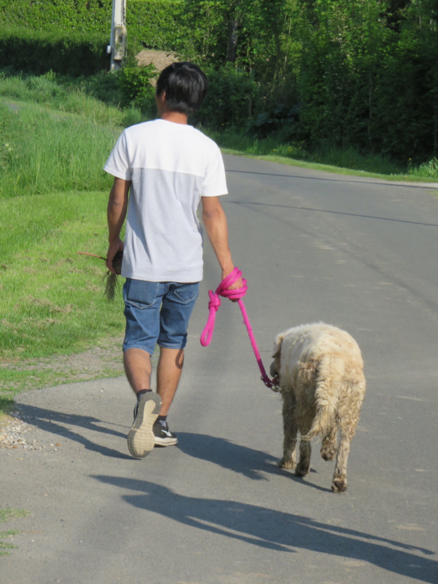 Il jardine avec Izu, la Golden Retriever qui ne le quitte plus. Il lui parle, lui raconte sa vie. Ces deux là s’en vont parfois sur le chemin, chacun réglant son pas sur le pas de l’autre. Il n’y a pas de maître, il n y a pas de chien : juste deux amis qui s’apprécient, en silence et marchent auprès des cerisiers.