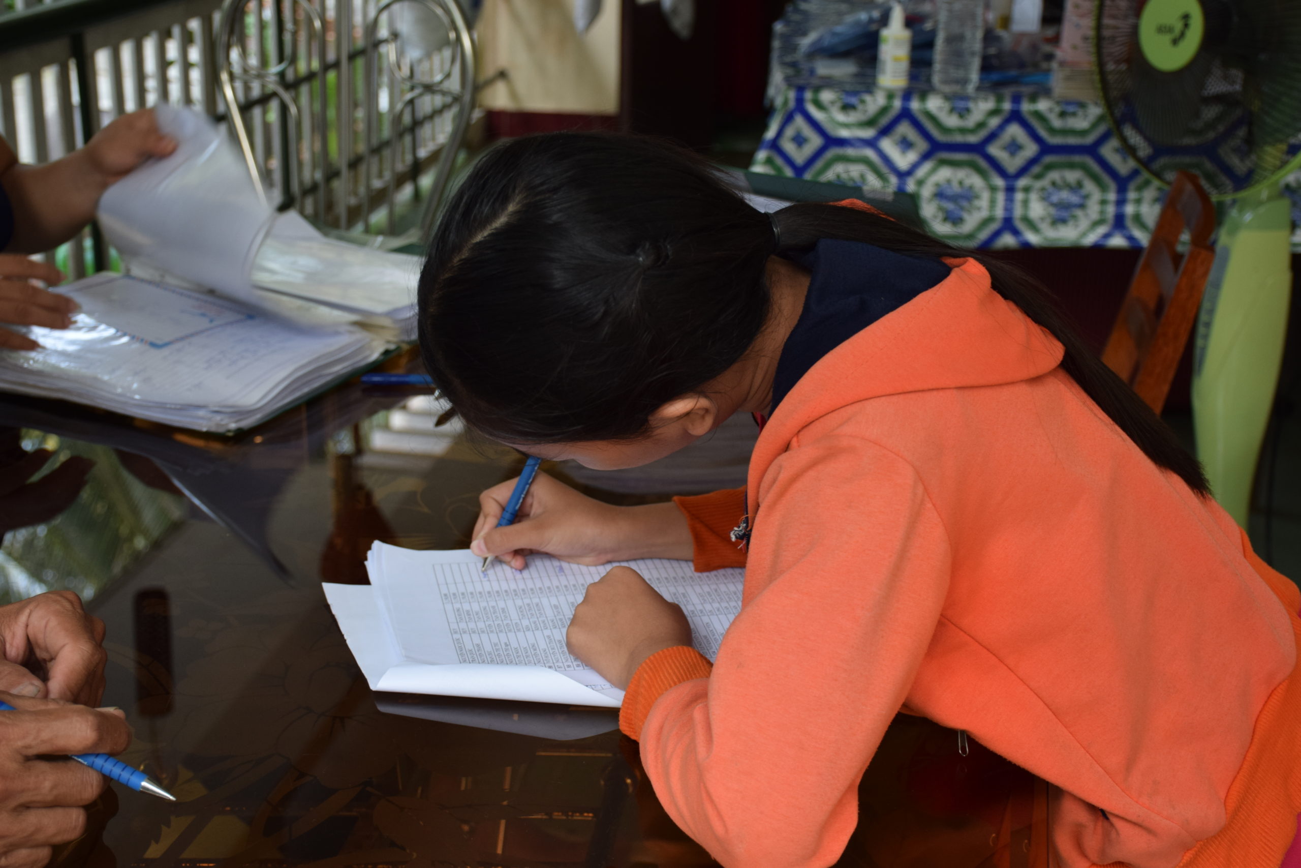 2. Une fois chez elle, Thi suit la liste que nous lui avons envoyée et répartit l’argent pour chaque enfant comme indiqué (plus de 420 enfants c est un gros gros travail).